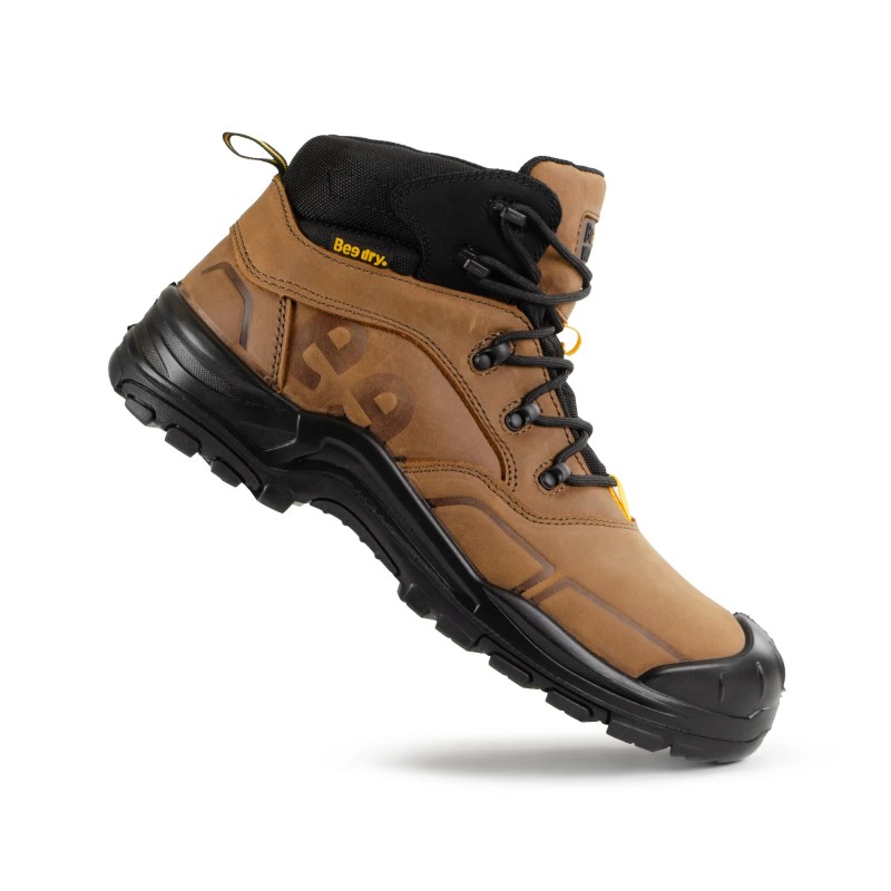 Fabricada en piel flor vacuna “crazy horse” hidrofugada (1,8–2,0 mm), con lengüeta y cuello de nailon de alta resistencia sobre espuma de látex. Incorpora membrana impermeable Bɘe dry, puntera no metálica de fibra de vidrio (200J / 15kN) y plantilla antiperforación no metálica PS (1100N). Suela EVA/PU + caucho nitrilo antiestática, resistente a hidrocarburos y con deslizamiento SR. Mondopoint 13.